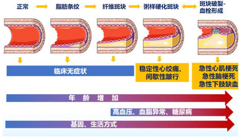 在年齡、吸煙、飲酒、高血壓、糖尿病、血脂異常等多種危險因素的影響下,正常的動脈血管壁上出現(xiàn)動脈粥樣硬化斑塊。