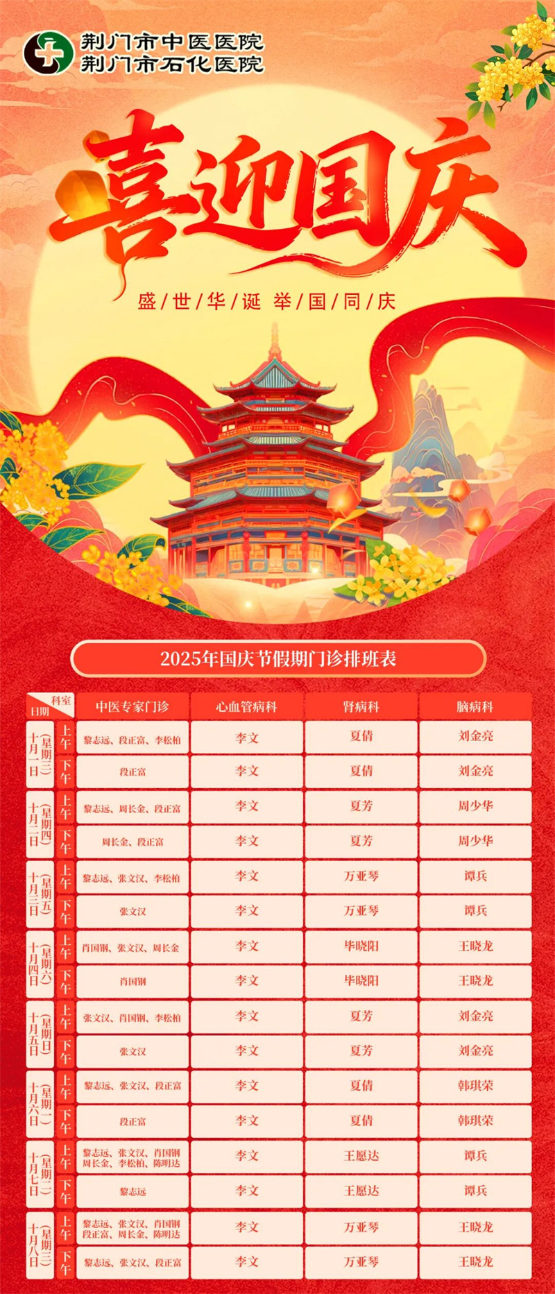 通知 | 荊門市中醫(yī)醫(yī)院2025年國(guó)慶節(jié)假期排班表→